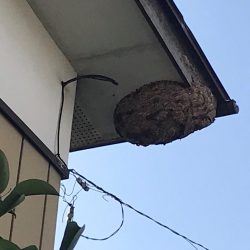 知らぬ間に! いつの間に? 隣りの空き家の屋根裏にハチの巣が・・ 最長40~50cmもありそうなデカいハチの巣ができていました。 スズメバチよりは小さい感じです。 そぉっとしておきましょう。