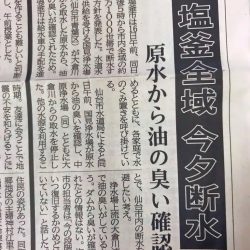 本日、2月16日午後5時から塩竈市が突然の断水となりました。 塩竈市は、2系統の水源から源水を取水しています。 その内の大倉川の沿川(地震の影響?)で油漏れがあり、それが水道に混入したようです。 断水になったのは10年ぶ[…]